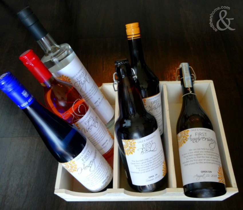 Unique Wedding Gift Idea a Year of Firsts in Liquor https://www.andthenhome.com/unique-wedding-gift-idea-year-firsts-liquor/ Thu, 17 Aug 2017 06:35:53 +0000 https://www.andthenhome.com/?p=2138 This past weekend we went to a wedding and naturally we needed to get them a gift. Wedding gifts can be tough, especially when the couple doesn’t have a registry. The bride and groom are established and have been living together for some time. They definitely didn’t need a blender or a toaster. We also wanted to make sure we got them something thoughtful as they are one on the sweetest couples we know. With only a few days left before the wedding, we were scratching our heads and praying for inspiration.  Luckily Mr. M saved the day (that’s my hubby for those who don’t follow us regularly) and suggested a basket full of wine, one for a different ‘first’ the couple will have as husband and wife. I’ll admit it… I wasn’t convinced at first. Our friends are not big wine drinkers, and what exactly would this gift look like? I checked it out online and found that a few companies do make labels for this unique gift; Wine Milestone Labels. I still wasn’t sold; seven bottles in one year for people who don’t drink wine regularly seemed like a lot. But as I was reading the wine labels I noticed one that said ‘first fight’. Eureka!! They may not exclusively drink wine but they do drink cocktails and beer.  So instead of just giving wine, we picked out seven different types of liquor!   The seven bottles we picked were: Vodka for ‘First Fight’   Bailey’s Irish Cream for ‘First Christmas’ Rose Wine for ‘First Valentine’s Day’ Large bottle of Craft Beer for ‘First BBQ’ German Wine for ‘First Day Back from the Honeymoon’  (their Honeymoon was a European Tour) Prosecco for ‘First Anniversary’ Champagne for ‘Wedding Night’ (this was the only bottle we brought to the wedding to give them that night. The rest of the bottles we dropped off to their home for convenience) The labels are easy to make. Design a label on your computer. I added and yellow flower because it matched their wedding colours. Feel free to use my design for inspiration and just change the names, dates and colours. Print the labels on sticky back label paper and attach to the bottles. Stack all the bottles in a sturdy basket or box, maybe try using a small wine holder and the couple can always reuse it after all the bottles are empty. Use basket gift shreds to cushion the bottles and wrap the whole gift in plastic wrap or tulle. I’m really happy with how this gift turned out. It’s personal and unique and will hopefully bring the new husband and wife happy reminders of their wedding day all year long. For more wedding ideas and inspirations check out our Perfectly Rustic Ring Bearer Pumpkin, Sweet and Modern Flower Girl Terrarium and the Top 11 Wedding Trends of 2017. Disclosure: Some of the links in this post are affiliate links.  There may be a small commission made by our recommendations, and/or link to products mentioned or services on this website.  Your purchase will help us continue to bring you amazing content, step-by-steps and product reviews.