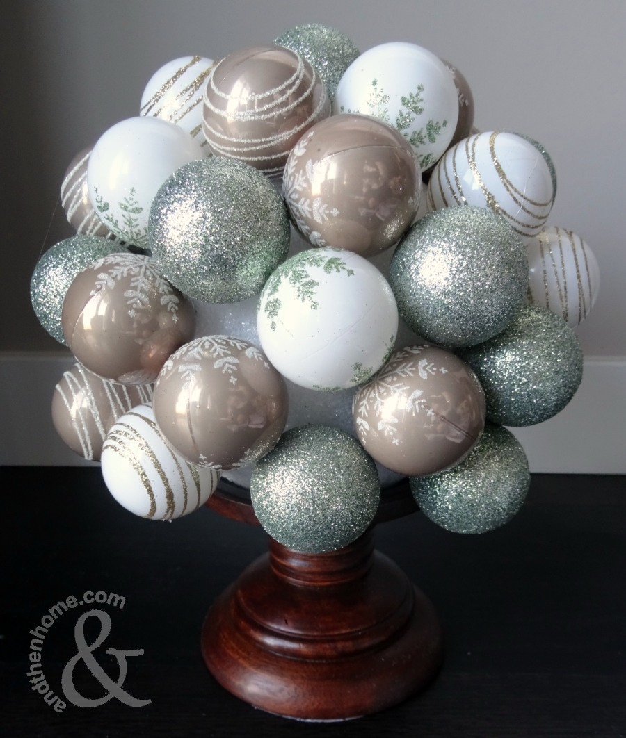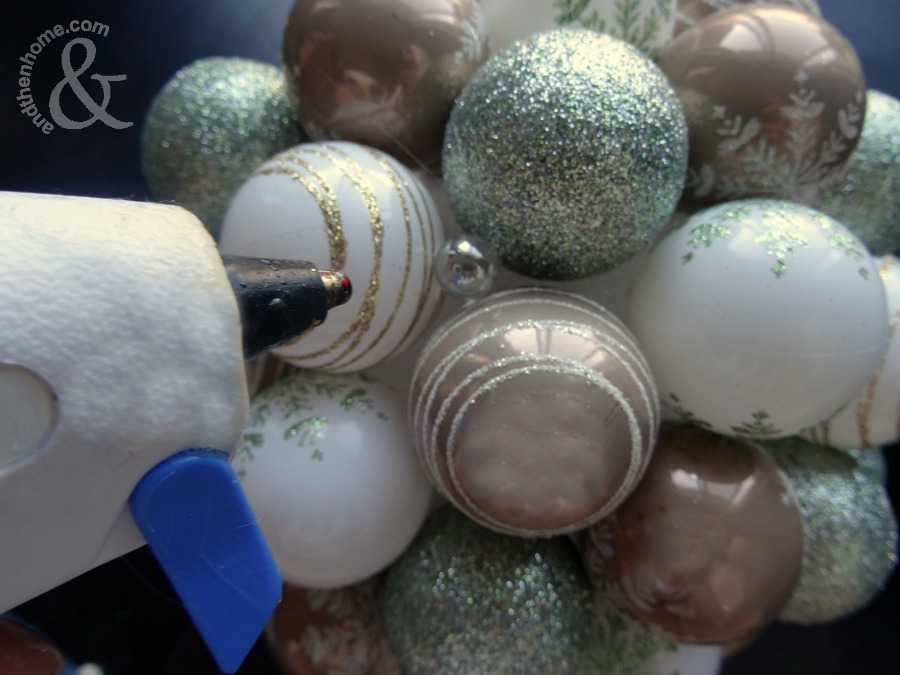 Secondly, begin pushing an ornament into the top of the Styrofoam ball. The top ‘bump’ should push into the Styrofoam. Add some glue to hold it in place.
