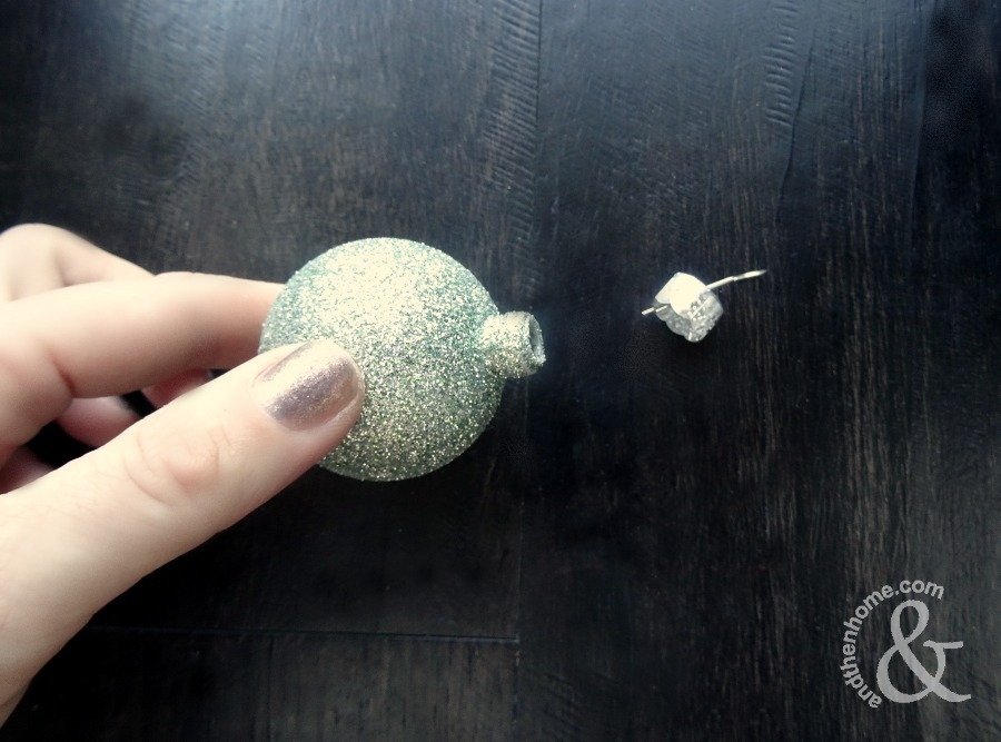 Firstly, cut the bottom of the Styrofoam ball so that it has a flat edge that will sit on the candle holder base. Remove the hanger pieces from the tops of the ornaments.