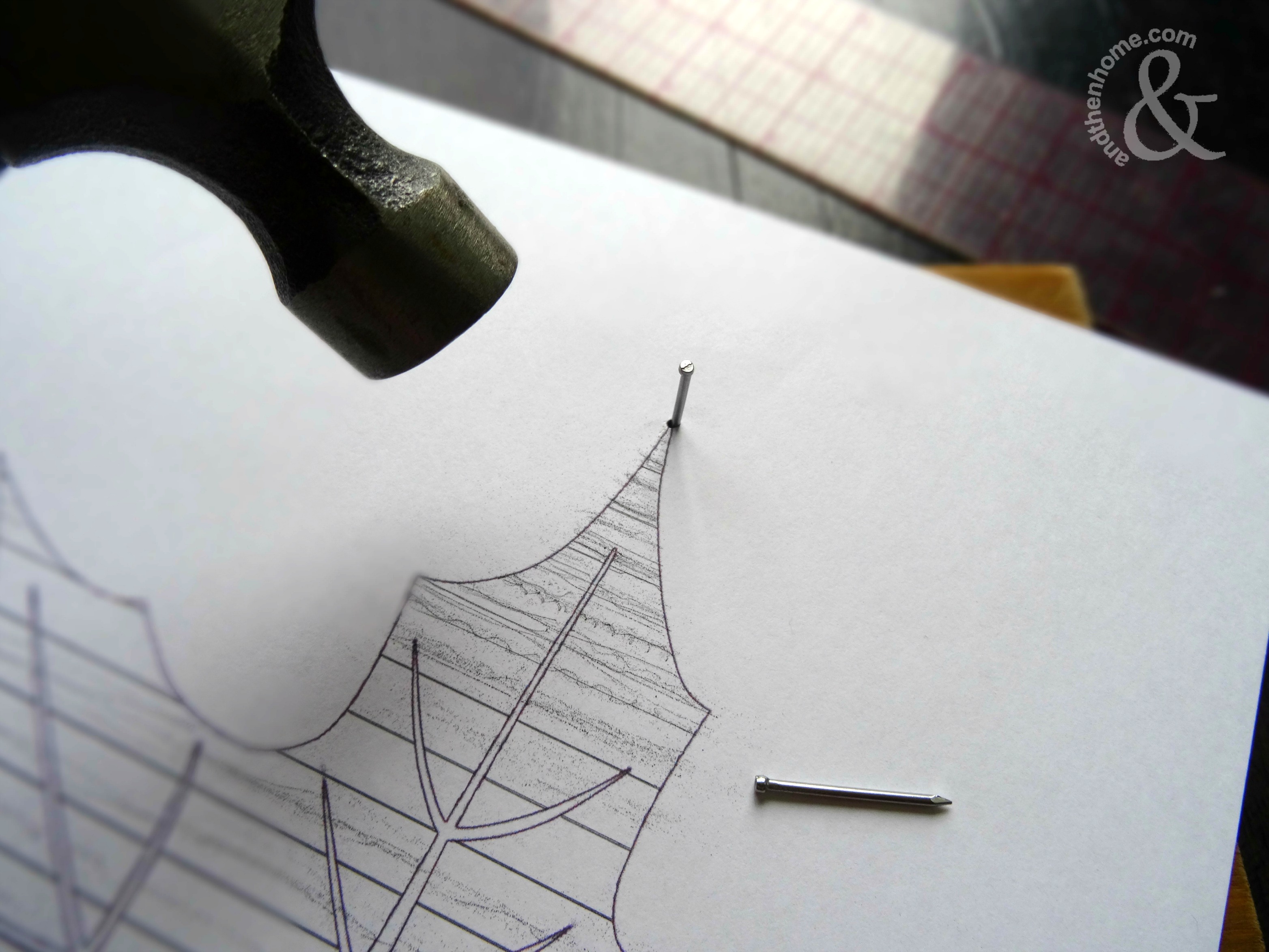 Start hammering the nails into the board, following the outline of the leaf. Place the nails about ½” apart.
