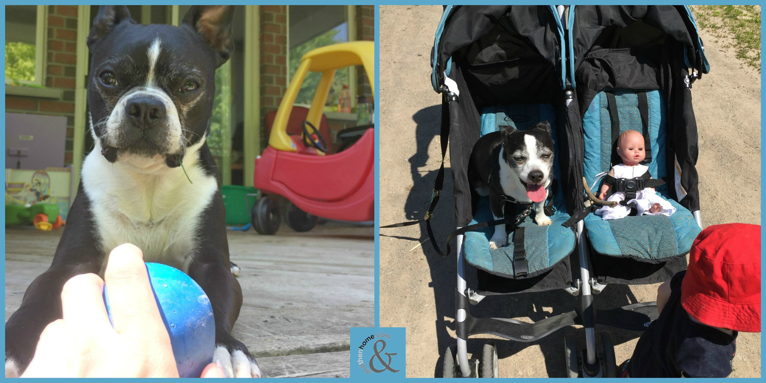 We might be able to squeeze in a walk or two and a game of fetch for our four legged kids. Although, at 12.5 years old our little guy needs some help from time to time and apparently…so does ‘baby’. Why do I insist on bringing the stroller? At least it’s being used by someone.